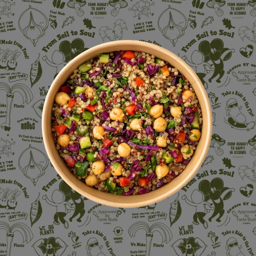 One of our best-selling salads! Refreshing, crisp, and delicious. Unlike traditional salads, it's reminiscent of Tabouleh, a herbed Lebanese salad with tomatoes and bulgur. Our salad features chopped vegetables, cooked chickpeas, and quinoa. When paired with our basil lemon vinaigrette dressing, the vegetables absorb all the flavors, creating a light yet satisfying meal.