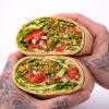 Ingredients: Baked falafel, creamy hummus, tomatoes, cucumber, parsley, onion pickles, romaine lettuce, purple lettuce, whole wheat wrap.