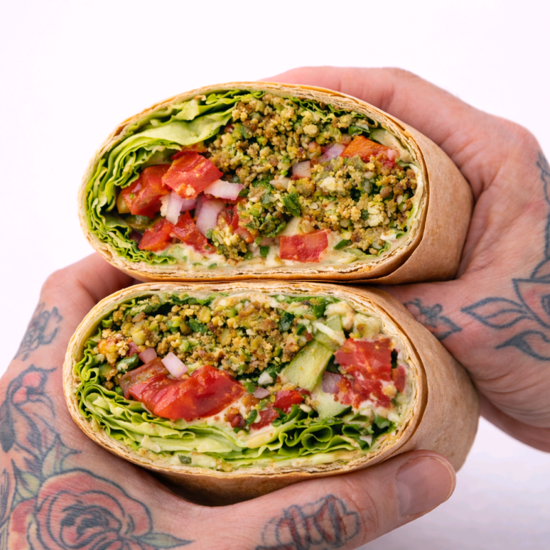 Indulge in our falafel wrap - an authentic, healthy, and earthy aromatic delight that's high in protein and absolutely delicious. Made with our flavorful baked falafel, creamy hummus, fresh veggies, and tangy pickles, all wrapped up in our wholesome whole wheat wrap.