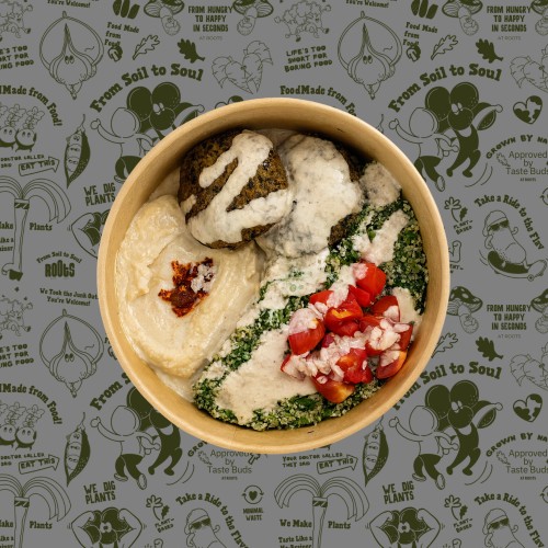 A great healthy and filling meal, featuring fresh tabbouleh, our special hummus, and 2 aromatic baked falafel. We also include harissa and tahini sauce. Enjoy a variety of Middle Eastern foods in just one bowl!