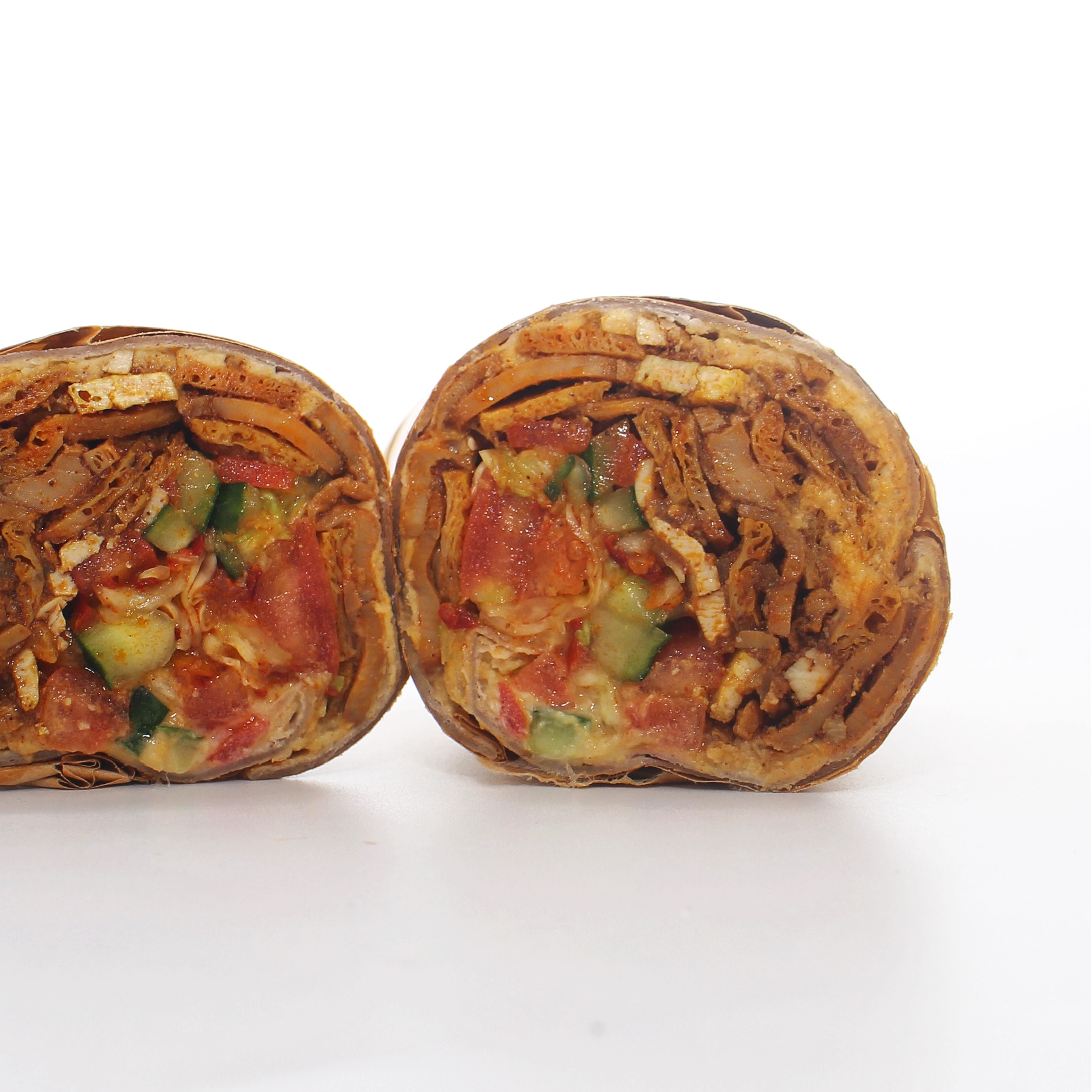 Ingredients: Yuba, firm tofu, king oyster mushrooms, onion, garlic, olive oil, spices, hummus (chickpeas, unhulled sesame tahini, lemon juice, spices), tomatoes, cucumber, white cabbage, dash of harissa, whole wheat wrap.