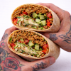 Our Vegan Shawarma Wrap is truly something special, featuring a variety of mushrooms and yuba—a type of dry soy product. We combine these with juicy tomatoes, crispy cabbage, crunchy cucumber, and creamy hummus in our whole wheat wrap. It's creamy, delicious, satisfying, and offers a very interesting texture! For the best experience, we recommend heating it up.