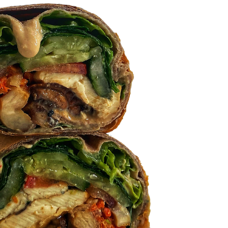 Ingredients: Romaine lettuce, cucumber, tomatoes, mushrooms, tofu, pickle carrot, basil, mint, coriander, peanuts, whole wheat wrap, Govegan sour cream.