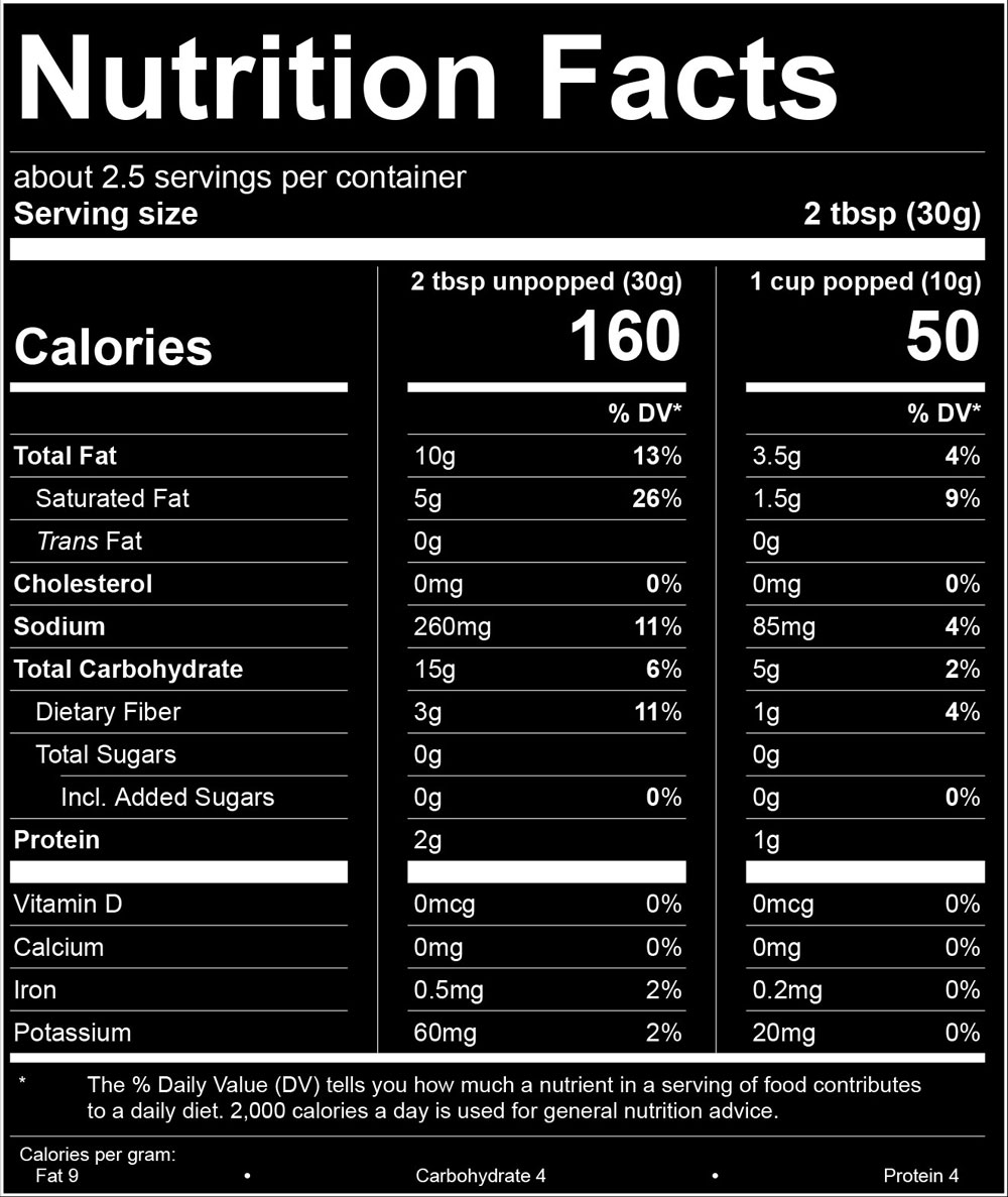 INGREDIENTS: Popcorn, Palm Oil, Salt, Butter (Cream, Salt), Natural Flavor (Palm Oil, Natural Flavors), Citric Acid (E330: Chelator), Annatto (E160b(i): Color)